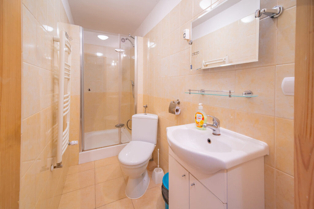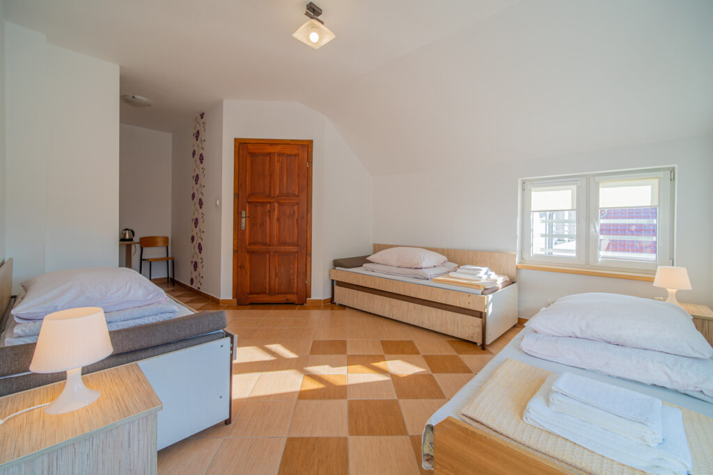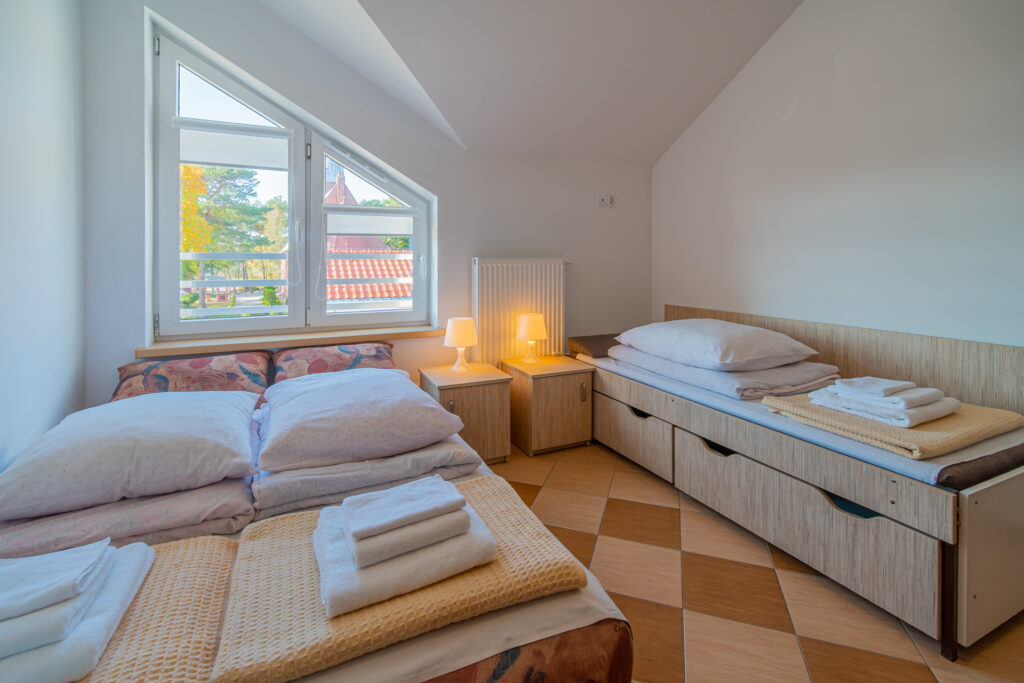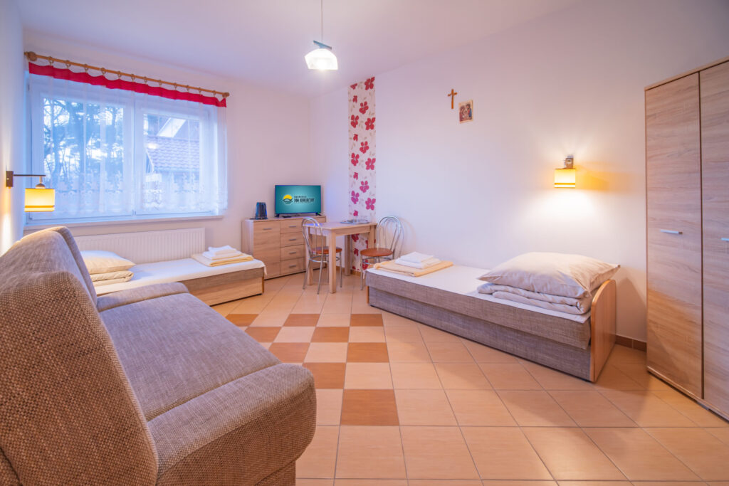 Wszystkie pokoje posiadają łazienki. Osoby przyjeżdżające w pojedynkę mieszkają w dwie, trzy osoby.
